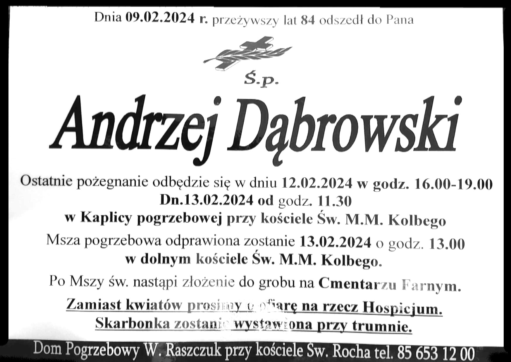 Ostatnie pożegnanie odbędzie się w dniu 12.02.2024 w godz. 16:00-19:00, oraz 13.02.2024 od godz. 11:30 w Kaplicy Pogrzebowej przy kościele pw. Św.M.M.Kolbego w Białymstoku. Msza pogrzebowa zostanie odprawiona 13.02.2024 o godzinie 13:00 w dolnym kościele pw. Św.M.M.Kolbego.